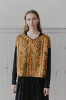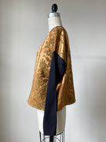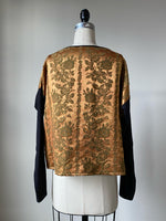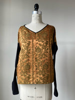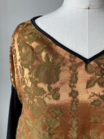 antique satin damask in rusted copper color with stretch skinny sleeves