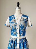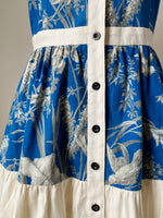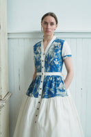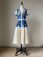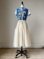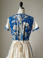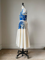19th century blue toile patched tiered dress xs,s,m,l
