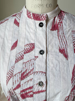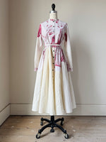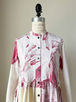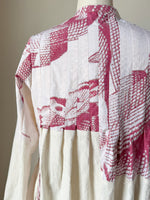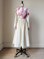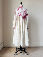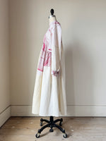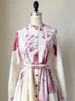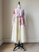 100% cotton pleated and stitched bodice dress in giant toile pattern and patched washed muslins