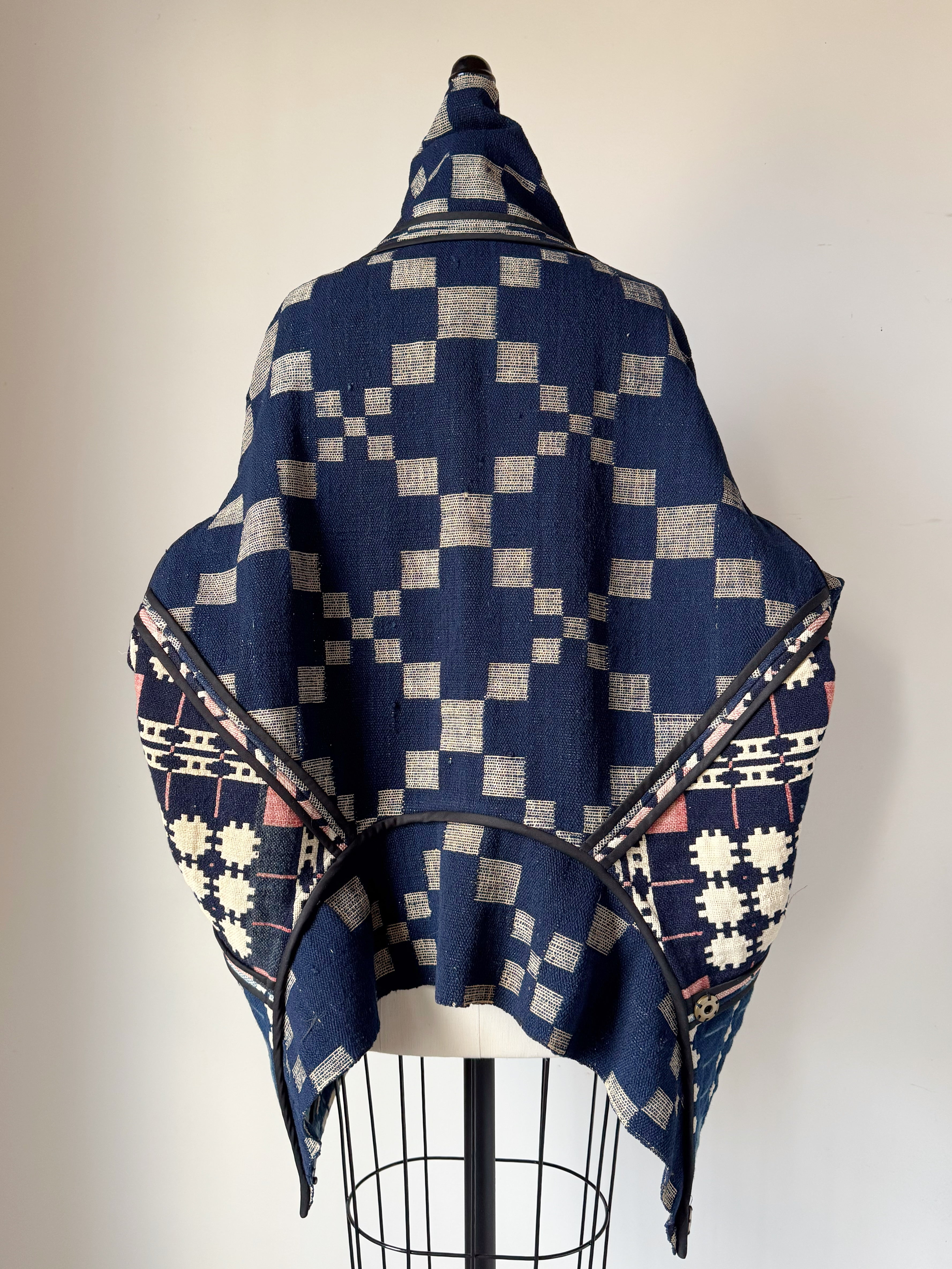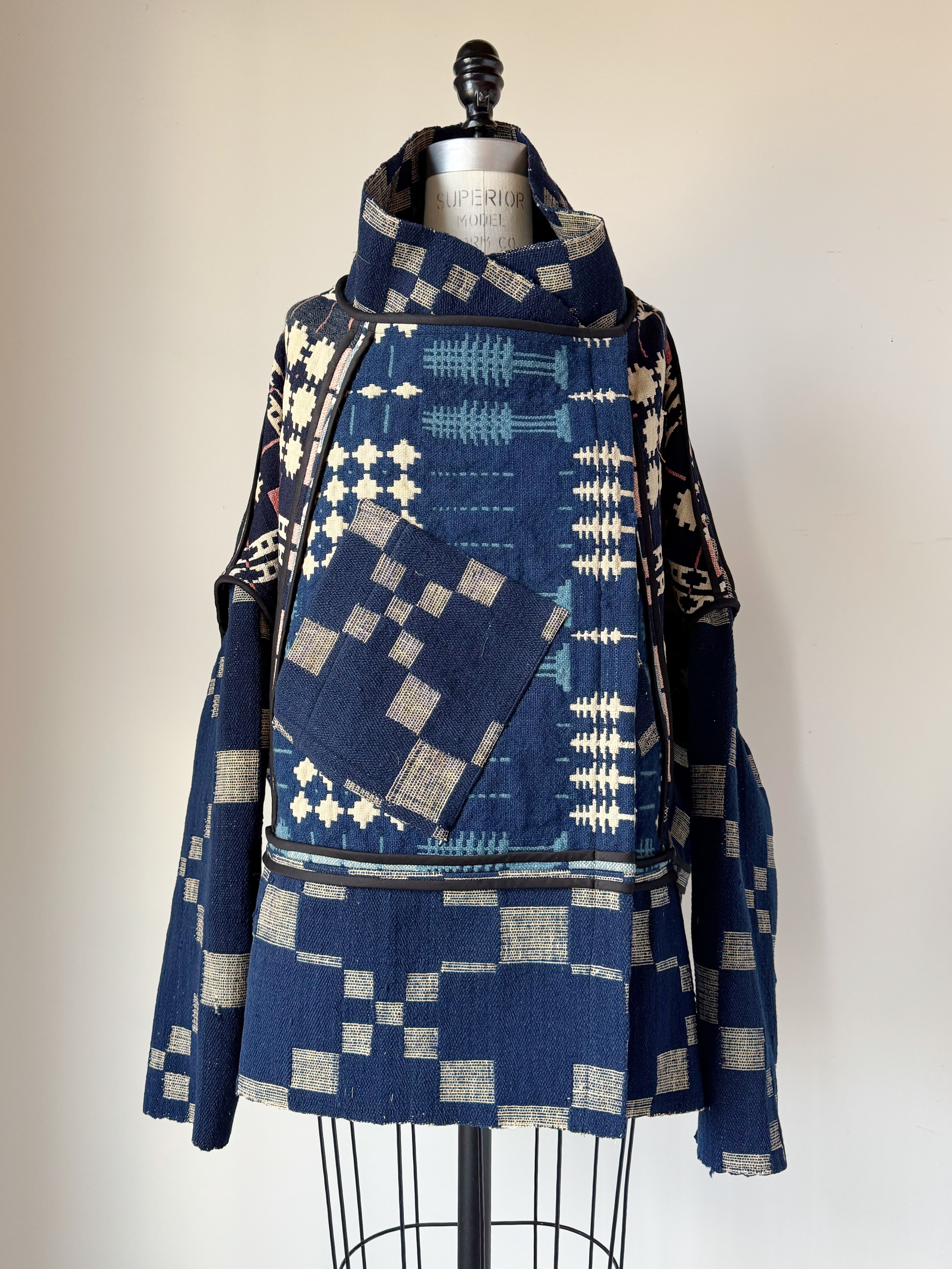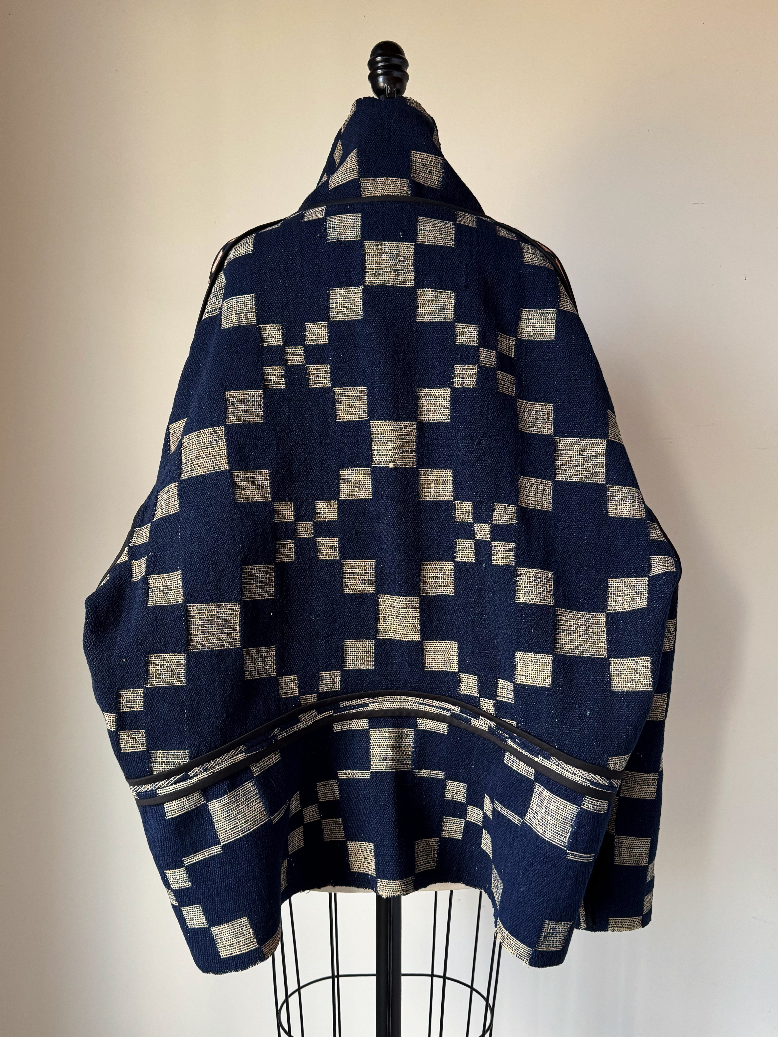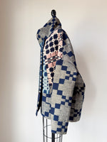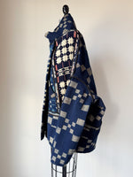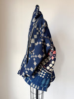 patched wool and cotton antique coverlet cocoon in navy and blues