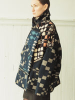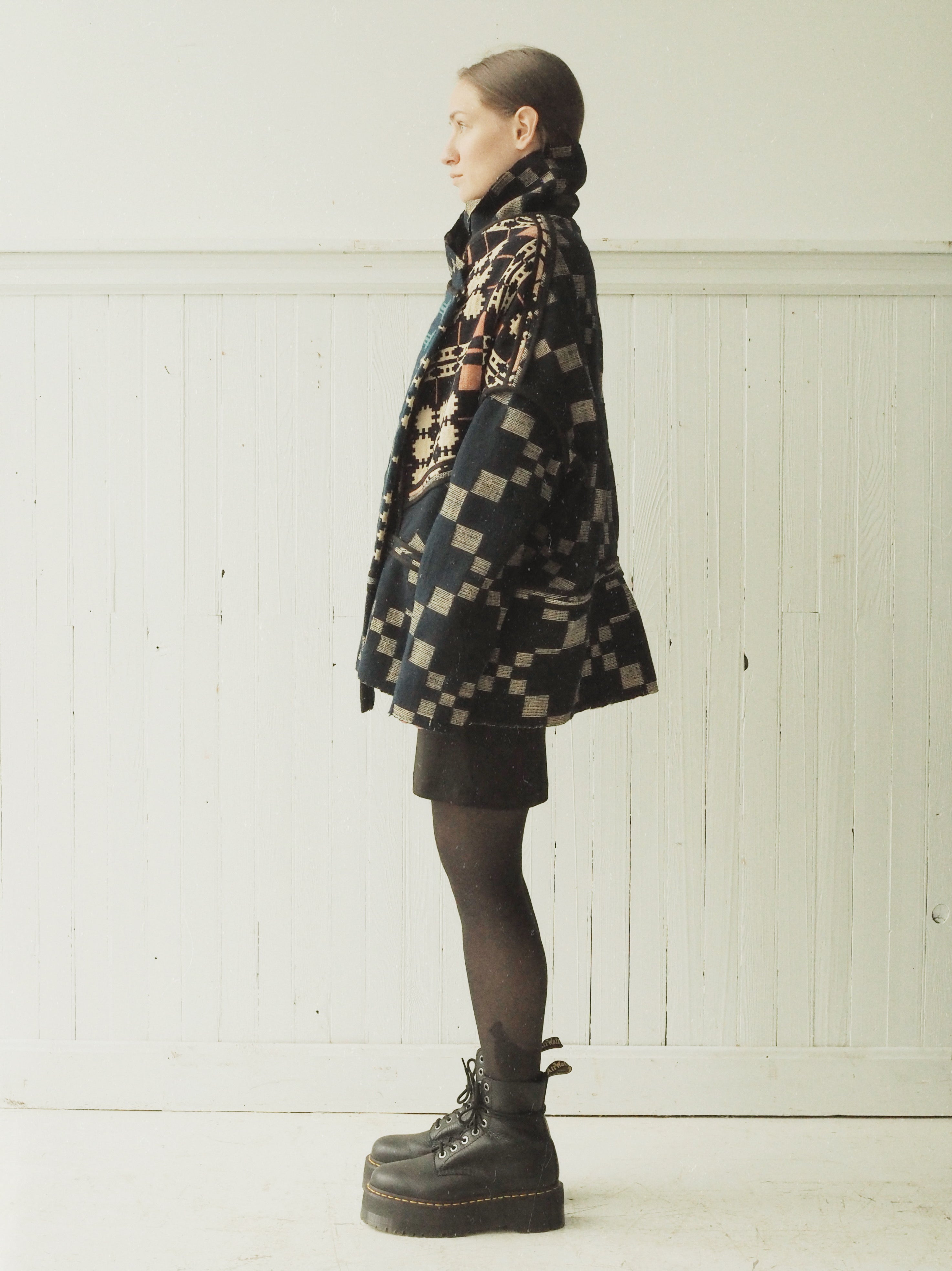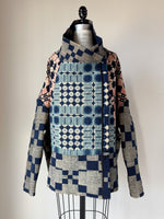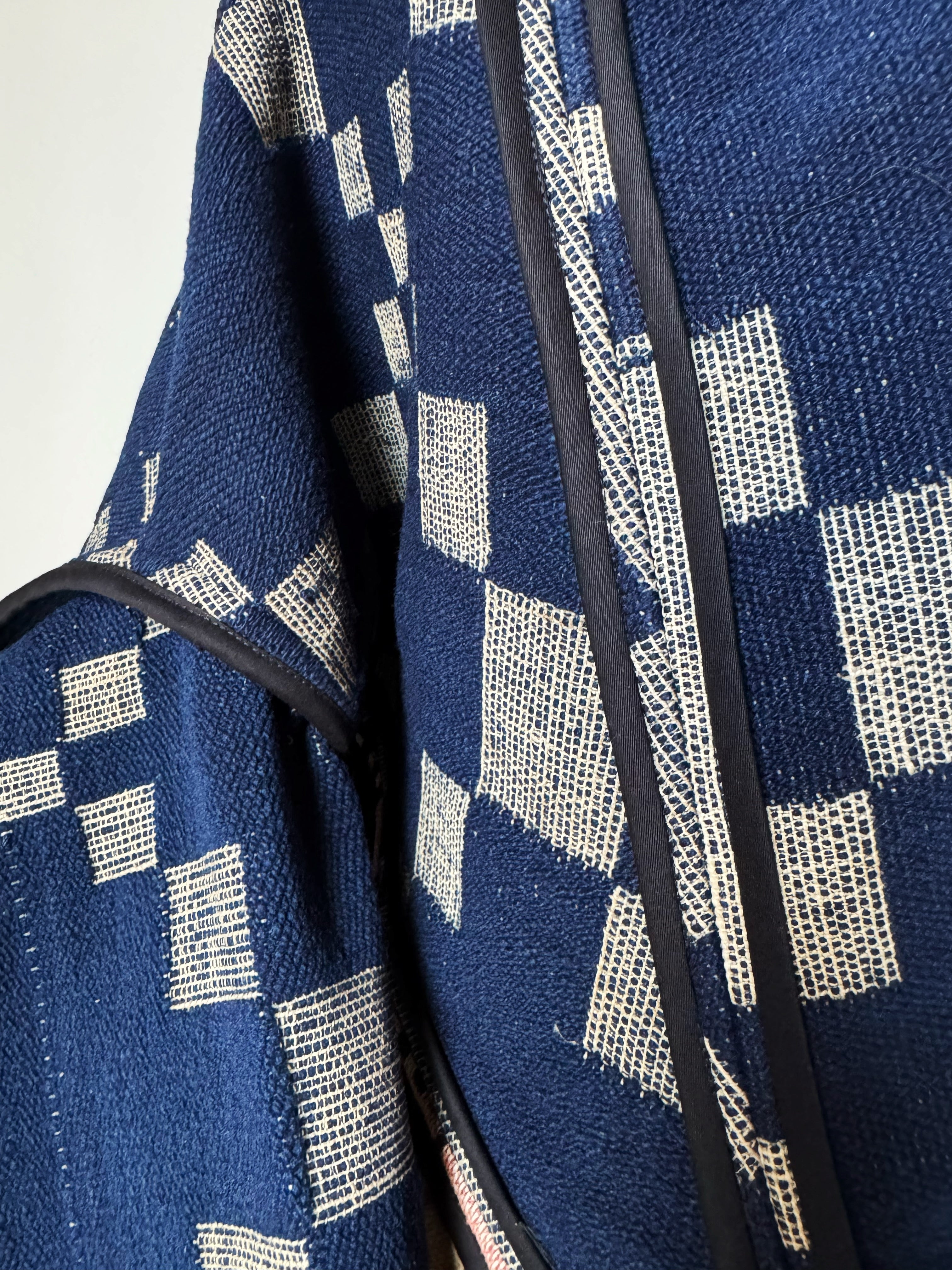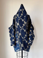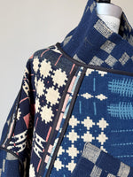 patched wool and cotton antique coverlet cocoon in navy and blues